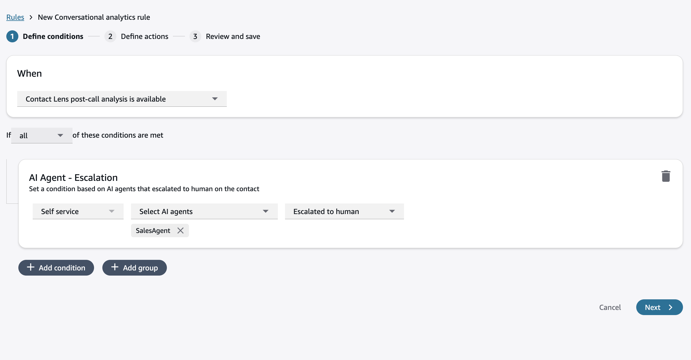 To trigger a self-service interaction evaluation, you can identify if specific AI agent(s) were active on the contact. You can also check for a specific AI agent version.