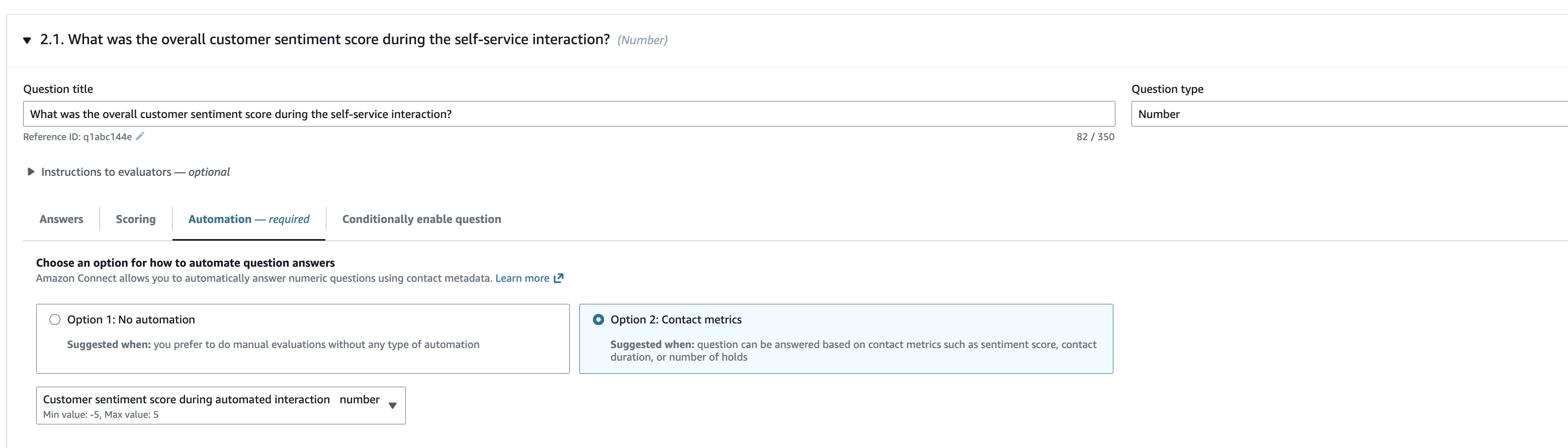 Amazon Connect provides you with the ability to automatically evaluate the quality of self-service interactions and get aggregated insights to improve customer experience. Managers can define custom criteria to assess the quality of self-service interactions, that can be filled manually or automatically using insights from conversational analytics, and other Amazon Connect data. For example, you can automatically assess if the AI agent repeatedly fails to understand the customer, resulting in poor customer sentiment and transfer to a human agent. Managers can review these insights in aggregate and on individual contacts, alongside self-service interaction recordings and transcripts, to identify opportunities to improve bot or AI agent performance.