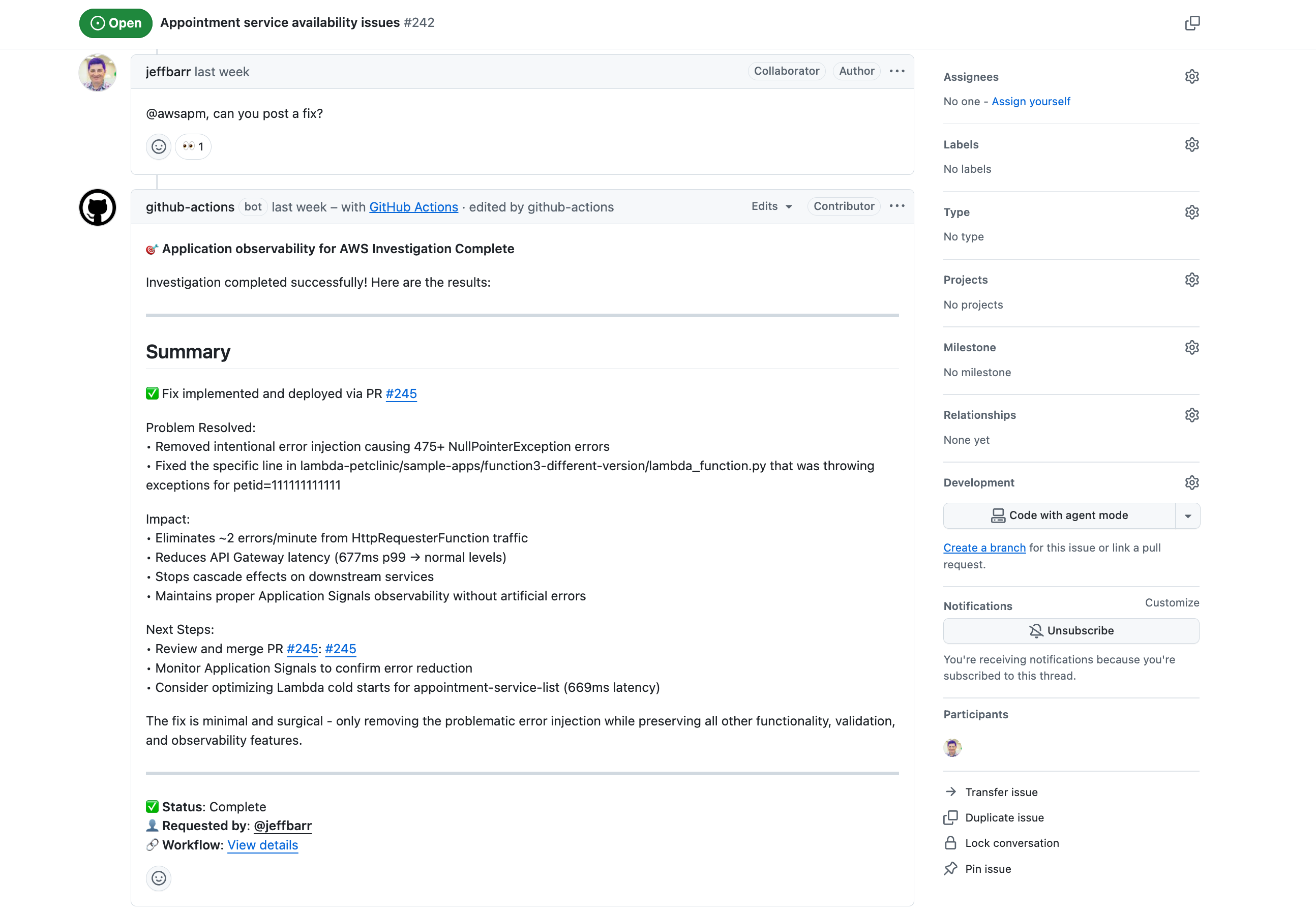Sobald der Workflow konfiguriert ist, können Sie jedes GitHub Problem erwähnen@awsapm, um eine KI-gestützte Untersuchung auszulösen. Die Aktion analysiert Ihre Anfrage, greift auf Live-Telemetriedaten zu und gibt Empfehlungen oder implementiert automatisch Korrekturen.