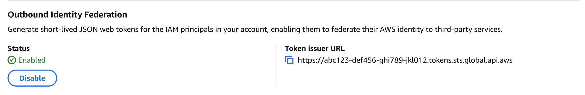 import boto3 # Create IAM client iam_client = boto3.client('iam') # Enable outbound identity federation response = iam_client.enable_outbound_web_identity_federation() print(f"Feature enabled. Issuer URL: {response['IssuerUrl']}") print(f"Status: {response['Status']}")