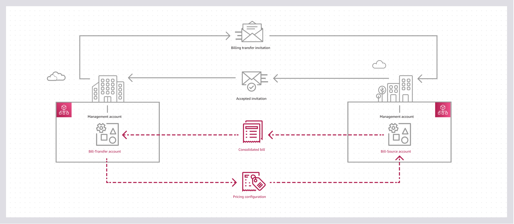 La transferencia de facturación permite a una cuenta de administración designar una cuenta externa a su organización para administrar y pagar su factura consolidada. Para configurar la transferencia de facturación, una cuenta externa (cuenta de transferencia de facturas) envía una invitación de transferencia de facturación a una cuenta de administración (cuenta de origen de facturas). Si se acepta, la cuenta externa pasa a ser la cuenta de transferencia de facturas y gestiona y paga la factura consolidada de la cuenta fuente de facturación a partir de la fecha especificada en la invitación.