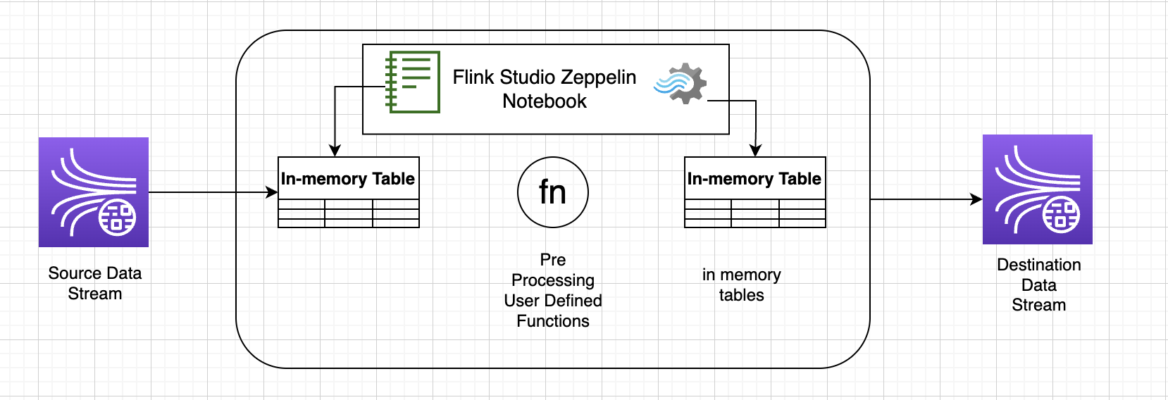 En este ejemplo de aplicación, demostraremos cómo aprovechar UDFs el cuaderno Zeppelin de KDA-Studio para procesar datos en la transmisión de Kinesis. Los blocs de notas de Studio para Kinesis Data Analytics le permiten consultar flujos de datos de forma interactiva en tiempo real y crear y ejecutar fácilmente aplicaciones de procesamiento de flujos mediante SQL, Python y Scala estándares. Con unos pocos clics Consola de administración de AWS, puede abrir un bloc de notas sin servidor para consultar flujos de datos y obtener resultados en cuestión de segundos. Para obtener más información, consulte Uso de un bloc de notas de Studio con Kinesis Data Analytics para Apache Flink.