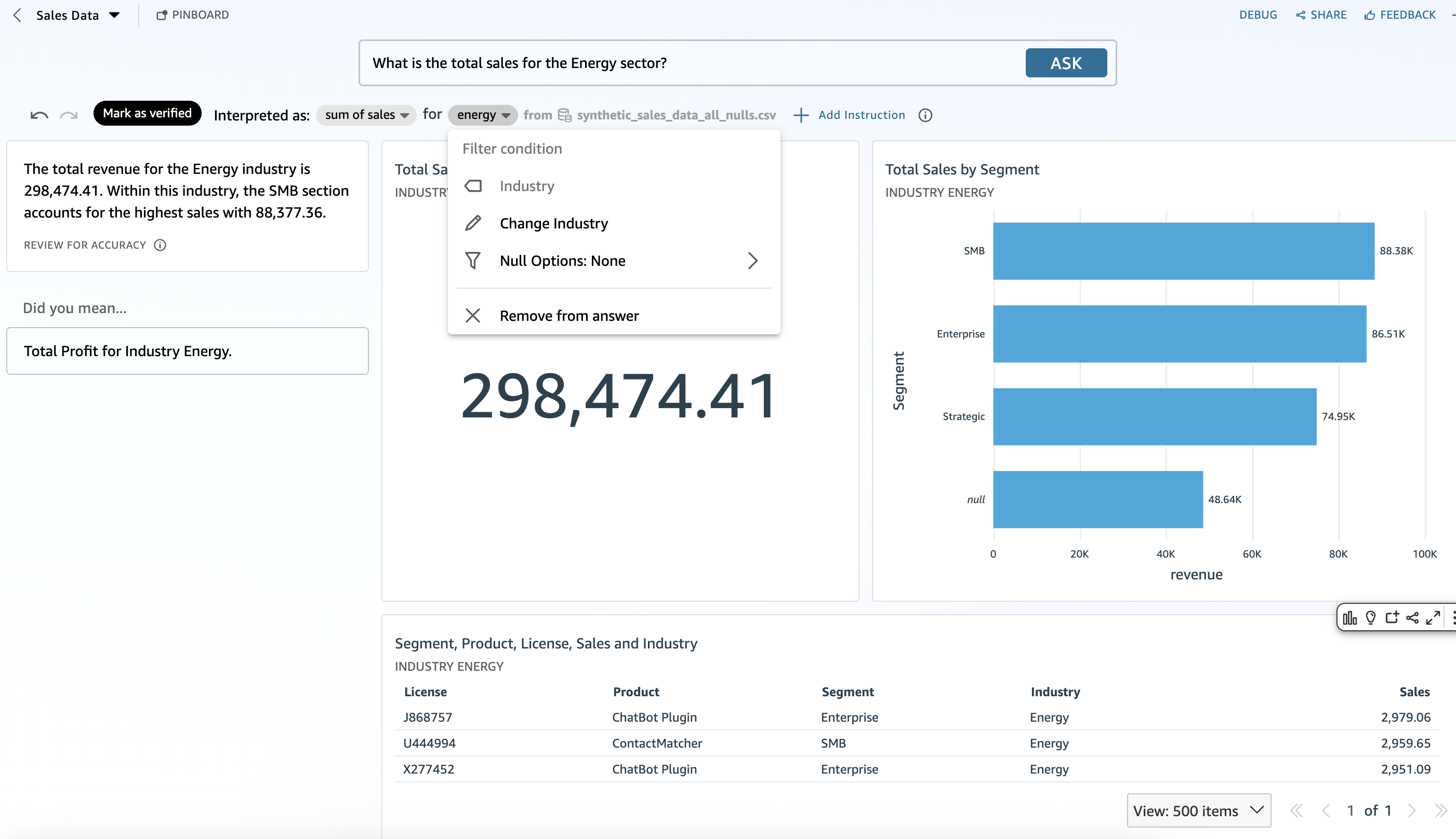 Amazon Quick Sight Q&A ofrece un soporte integral para la gestión de valores nulos, lo que permite a los usuarios crear análisis más sofisticados y responder a preguntas empresariales complejas. Esta funcionalidad permite filtrar con precisión los valores nulos, hacer consultas intuitivas sobre los datos faltantes e interactuar de forma dinámica con los gráficos.