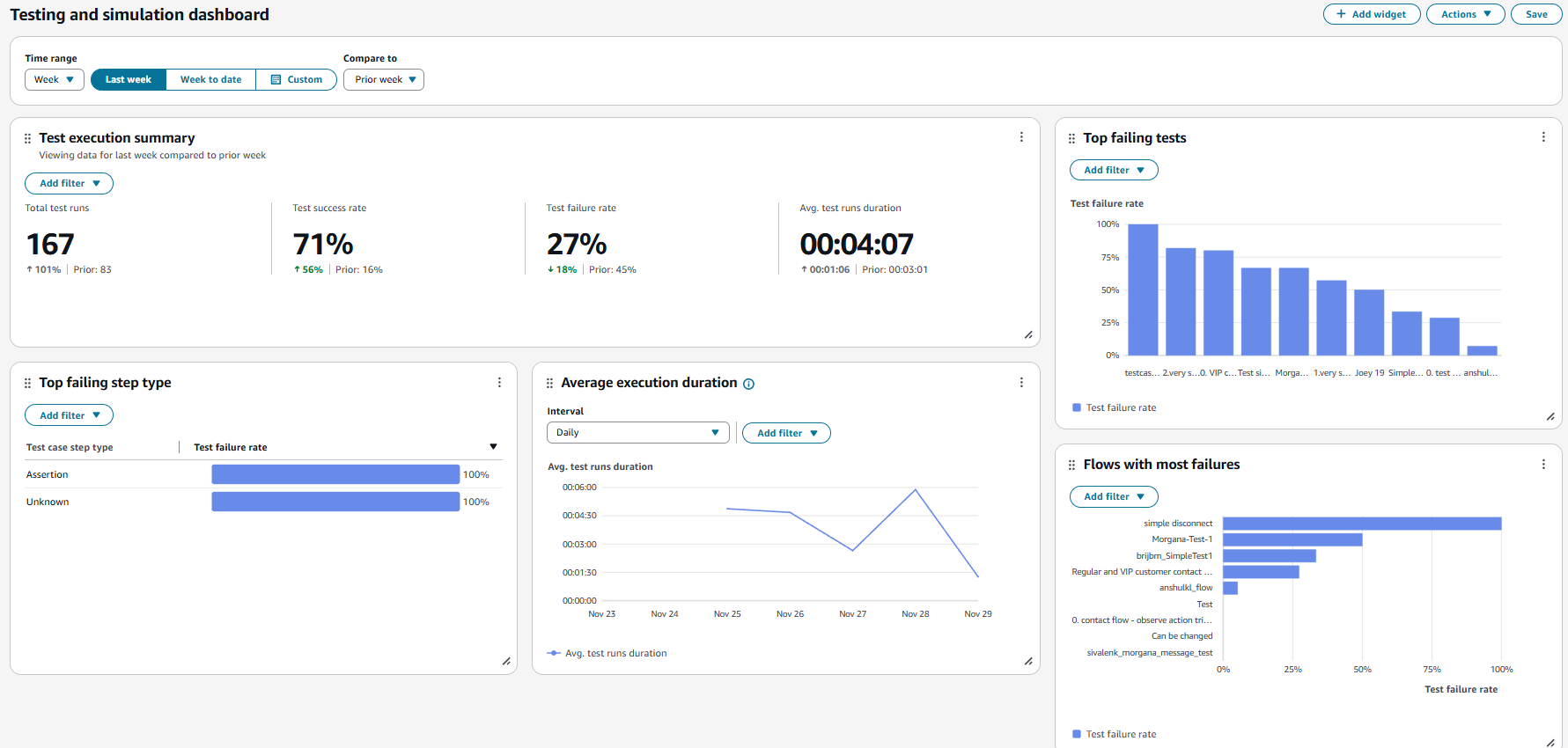 Choisissez le tableau de bord de test et de simulation. Le tableau de bord affiche des rapports d'analyse sur l'exécution des tests, notamment des mesures récapitulatives, la ventilation des différentes mesures d'échec et des mesures de durée d'exécution.