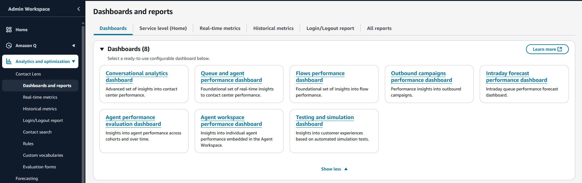 Amazon Connect prend en charge les tableaux de bord et les indicateurs de test et de simulation. Pour consulter ces tableaux de bord, vous devez définir l'autorisation sur la page des profils de sécurité pour Analytics and Optimization for Dashboards pour tous et définir l'autorisation dans les profils de sécurité pour les tests et la simulation pour que le scénario de test puisse être consulté.