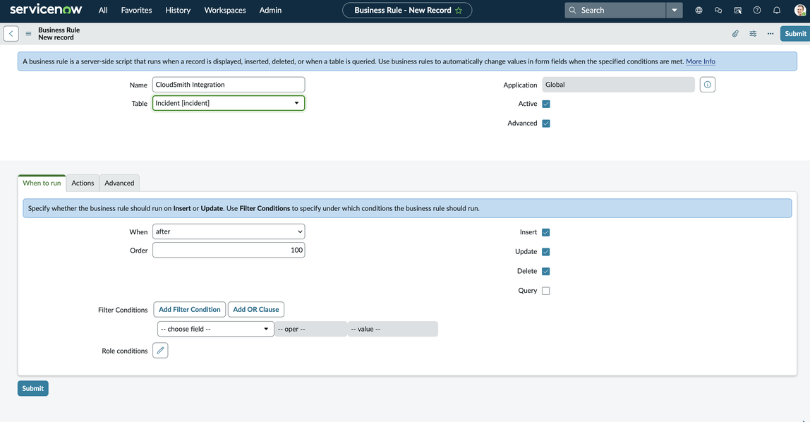 Définissez le champ « Table » sur « Incident [incident] », cochez la case « Avancé » et définissez la règle à exécuter après l'insertion, la mise à jour et la suppression.