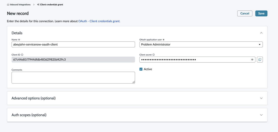 Choisissez « Nouveau » > « Nouvelle expérience d'intégration entrante » > « Nouvelle intégration » > « OAuth - Octroi des informations d'identification du client »