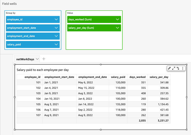 L’exemple suivant calcule le nombre de jours travaillés par chaque employé et le salaire dépensé par jour pour chaque employé :