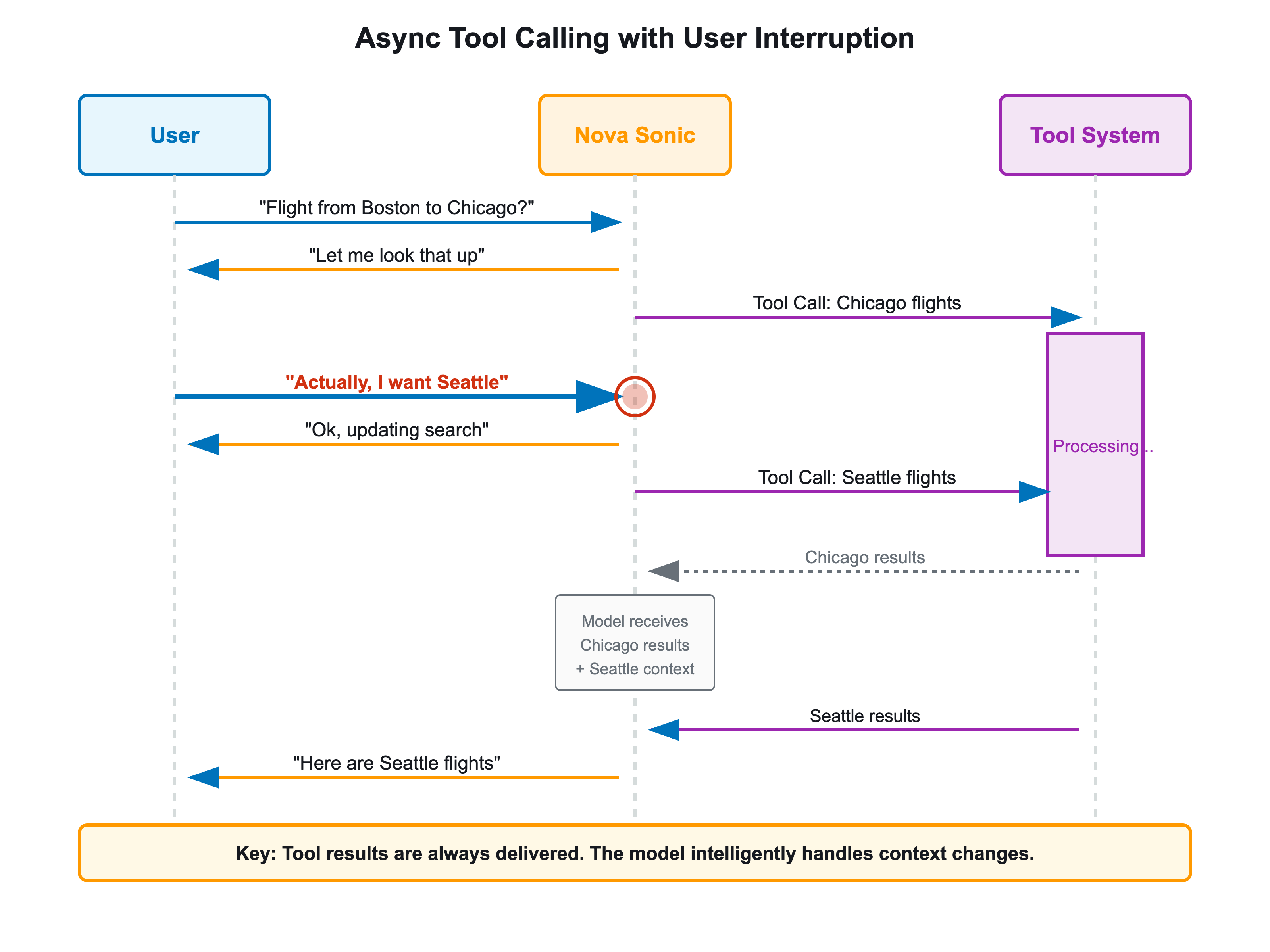 Tidak seperti panggilan alat sinkron tradisional di mana AI menunggu diam-diam untuk hasil alat, pendekatan asinkron Amazon Nova 2 Sonic memungkinkannya untuk: