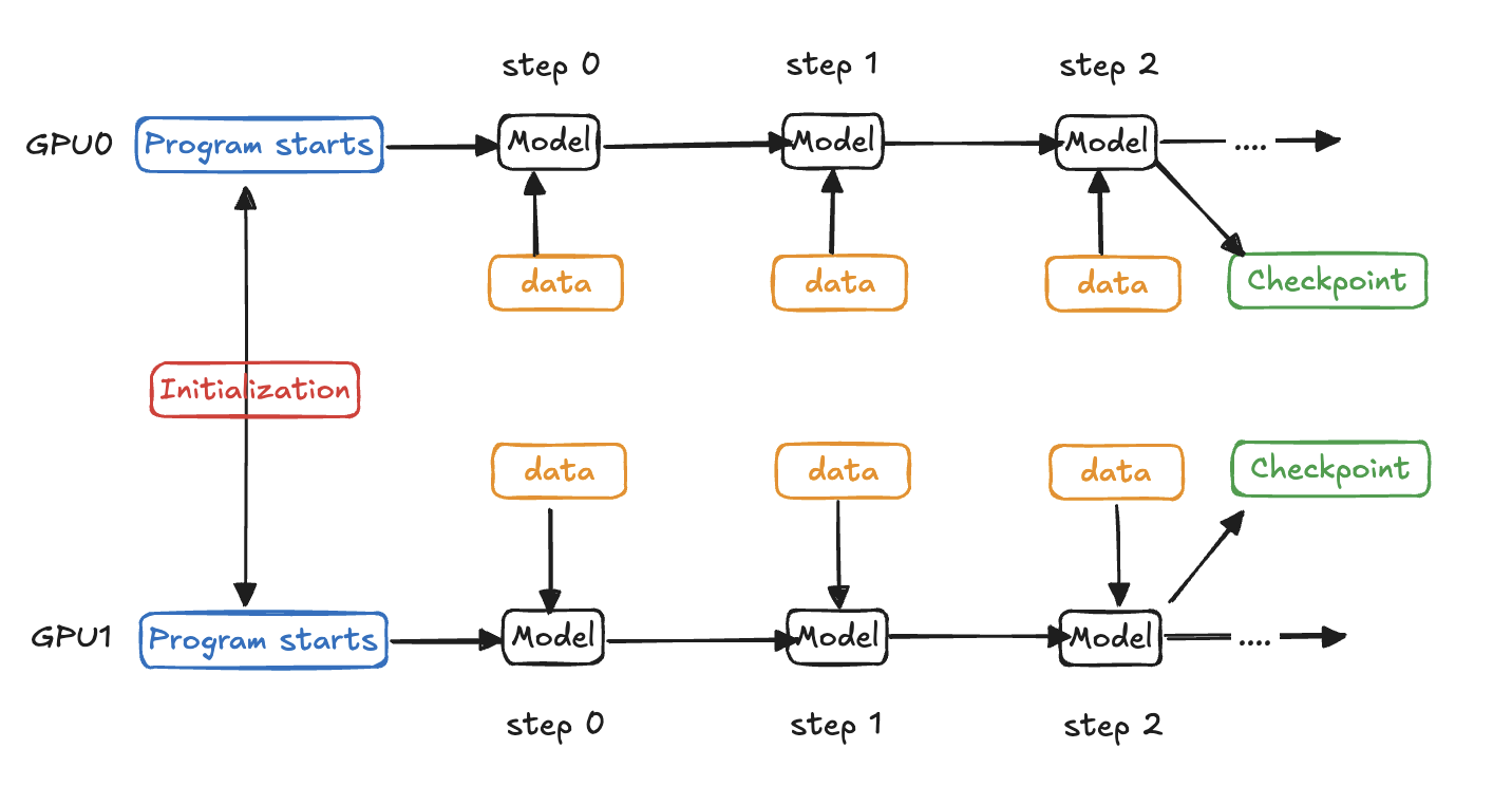 Program restart pengurangan overhead - Minimalkan biaya restart dan aktifkan pengisian tanpa pemeriksaan melalui pemulihan proses pada node sehat (kotak biru dan hijau di bawah).