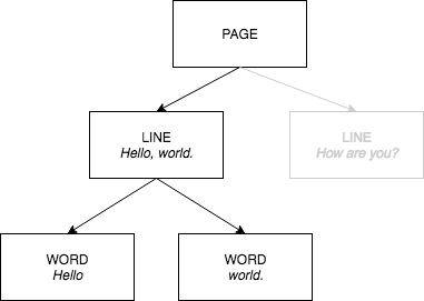 PAGE,LINE, danWORDblok terkait satu sama lain dalam hubungan orang tua-ke-anak. SEBUAHPAGEblok adalah induk untuk semuaLINEblok objek pada halaman dokumen. Karena GARIS dapat memiliki satu atau beberapa kata, makaRelationshipsarray untuk blok LINE menyimpan ID untuk blok WORD anak yang membentuk baris teks.