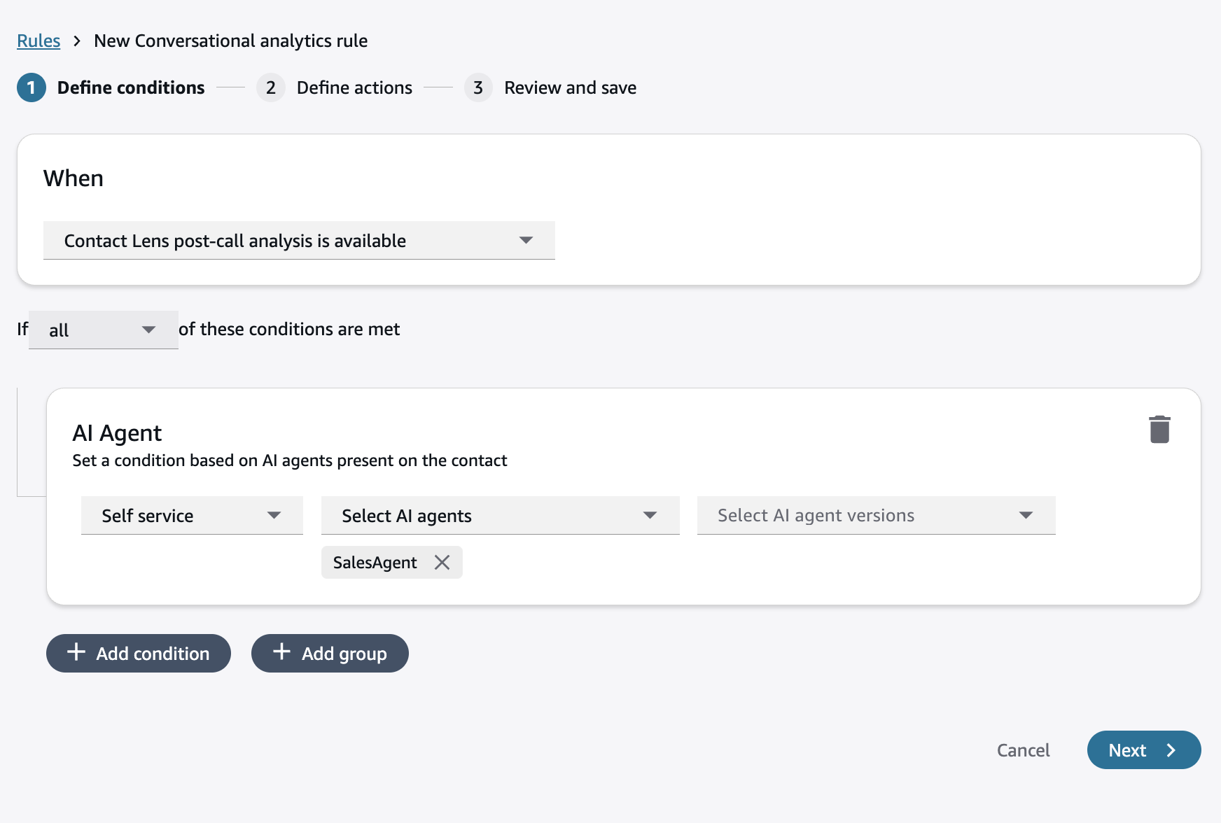 Per attivare una valutazione dell'interazione self-service, puoi identificare se uno o più agenti AI specifici erano attivi sul contatto. Puoi anche verificare la presenza di una versione specifica dell'agente AI.