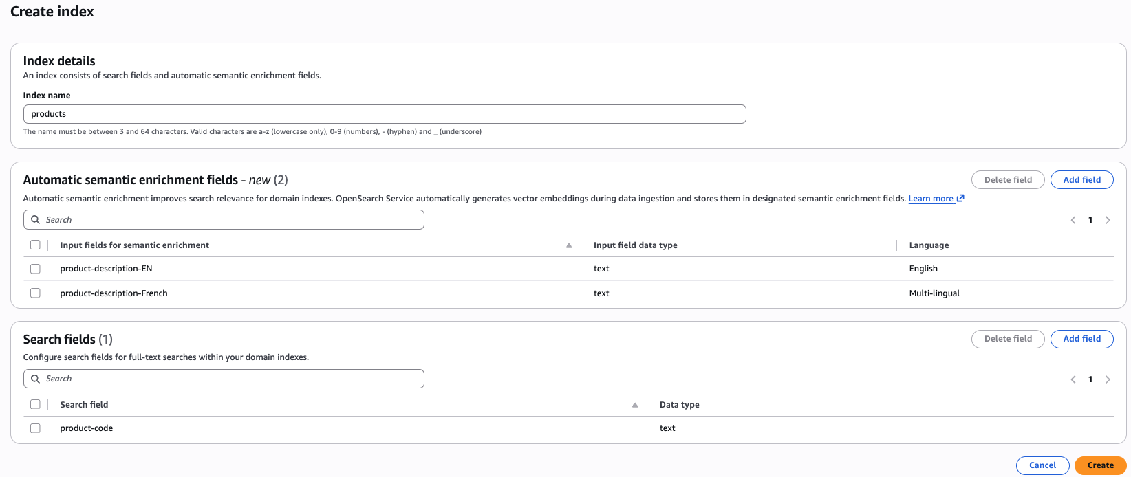La configurazione di un indice con l'arricchimento semantico automatico abilitato per i campi di testo è semplice e puoi gestirlo tramite la console e i CloudFormation modelli durante la creazione di APIs nuovi indici. Per abilitarlo per un indice esistente, è necessario ricreare l'indice con l'arricchimento semantico automatico abilitato per i campi di testo.