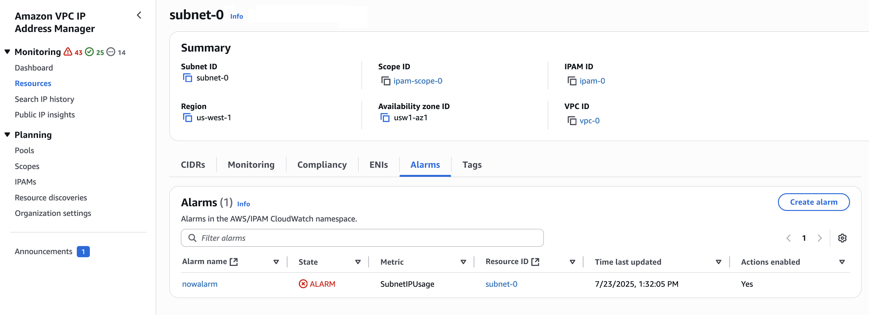 Per gestire gli allarmi per risorse specifiche, seleziona Risorse, quindi scegli un VPC, una sottorete o un pool. Quando si apre la pagina dei dettagli della risorsa, seleziona la scheda Allarmi.