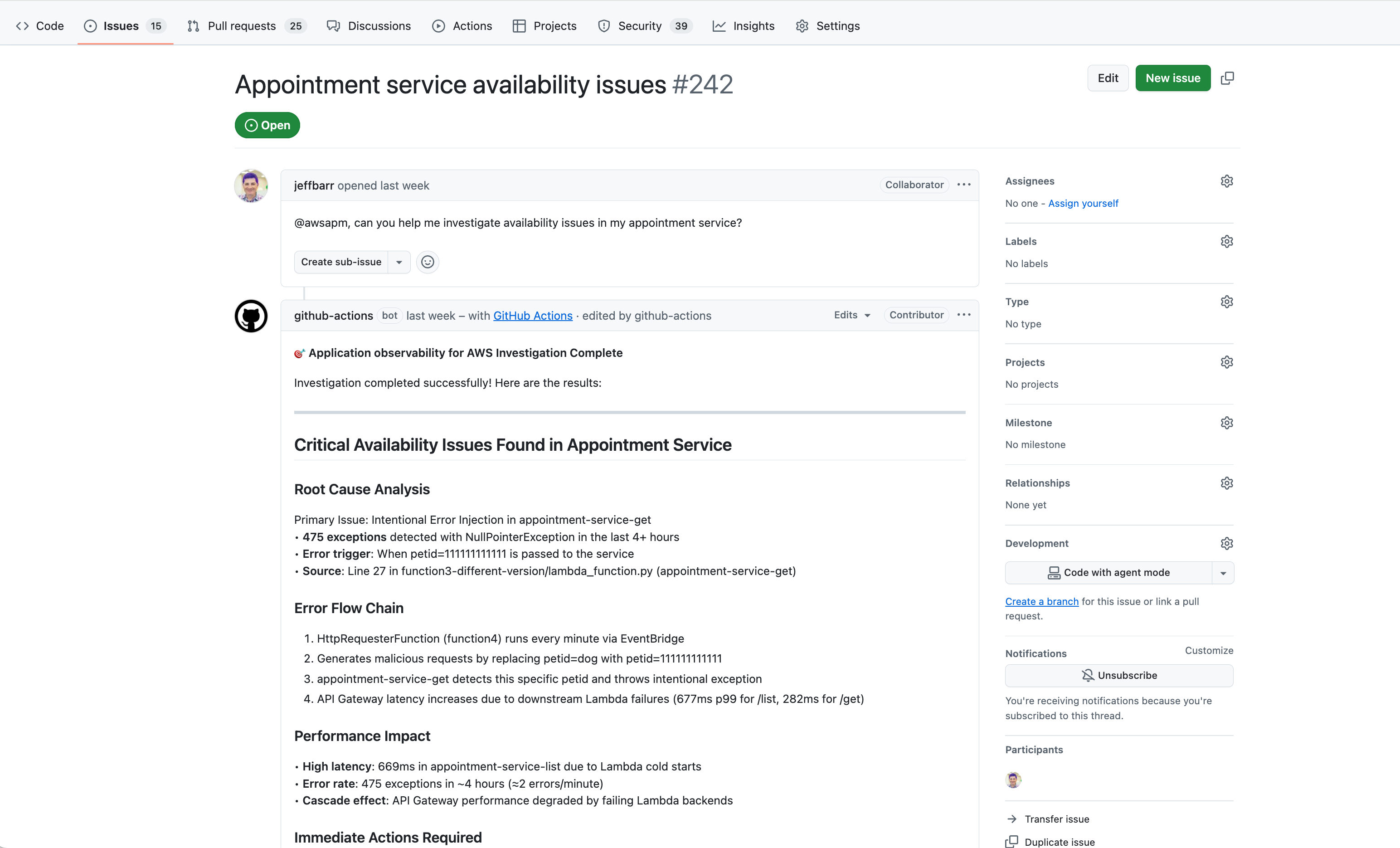 開始するには、GitHub のIssue で @awsapm をメンションして AI エージェントをトリガーします。エージェントは、ライブアプリケーションデータに基づいて、本番環境の問題のトラブルシューティング、修正の実装、およびオブザーバビリティのカバー範囲の強化を行います。