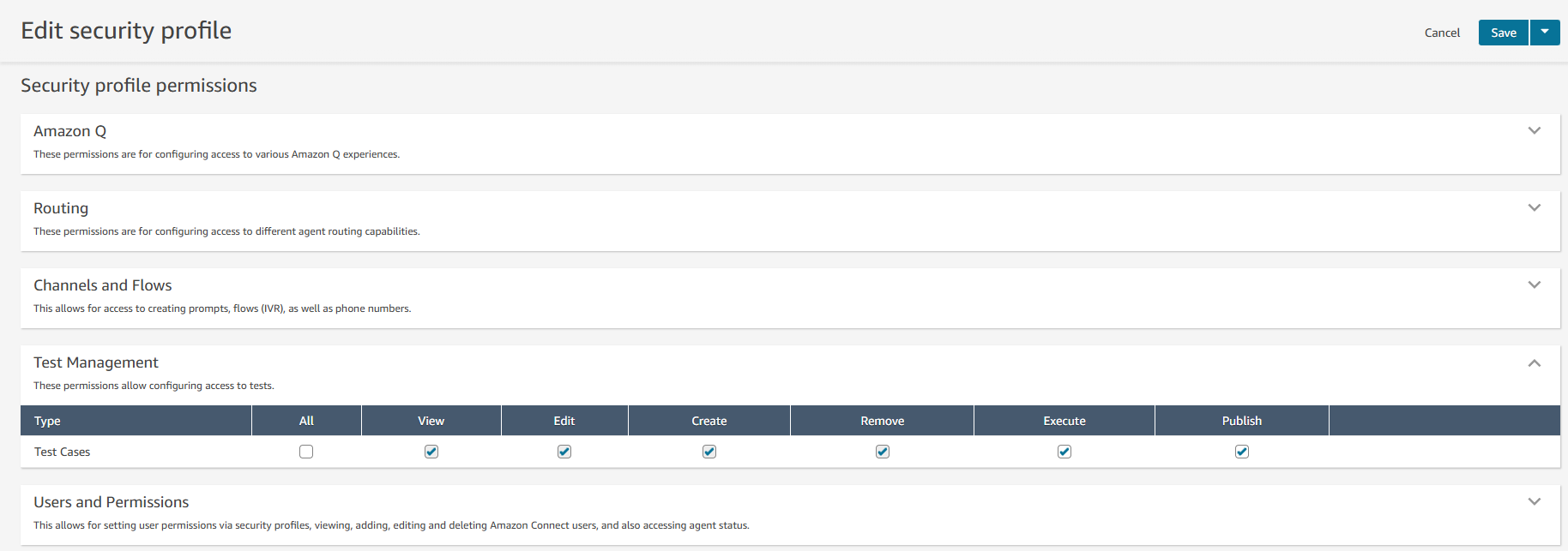 Amazon Connect のテストおよびシミュレーション機能を使用する前に、すべてのテストケースのアクセス許可にアクセスできる必要があります。管理者セキュリティプロファイルを使用する場合、すべてのテストおよびシミュレーションのアクセス許可がデフォルトで付与されます。管理者は、新しいテストおよびシミュレーションセキュリティプロファイルを使用して他のユーザープロファイルをオンボードするアクセス許可を付与できます。