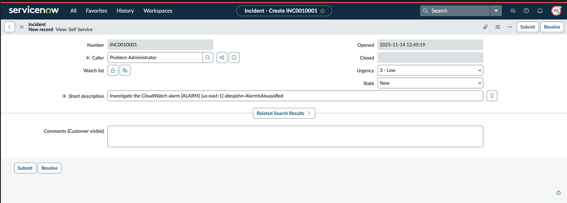 如果您选择从 “能力提供者” 页面注册 ServiceNow 连接,则现在需要导航到要调查 ServiceNow 事件单的 DevOps 代理空间,选择 “功能” → “通信”,然后在 “能力提供者” 页面上注册的 ServiceNow 实例。现在,一切都应设置完毕,所有将呼叫者设置为 “问题管理员”(模仿您授予 AWS DevOps OAuth 客户端的权限)的事件都将在已配置的 DevOps 代理空间中触发事件响应调查。您可以通过在中创建新事件 ServiceNow 并将事件的 “来电者” 字段设置为 “问题管理员” 来测试这一点。