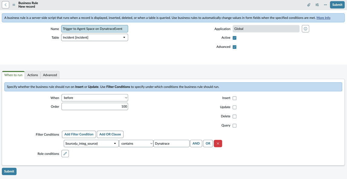 接下来,在 AgentSpace B 中 ServiceNow 创建另一条业务规则,只有当服务为 Dynatrace AWS 且来源为 Dynatrace 时,才会触发该业务规则。