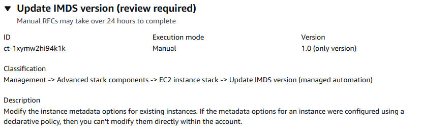 完整分類:管理 | 進階堆疊元件 | EC2 執行個體堆疊 | 更新 IMDS 版本 (需要檢閱)