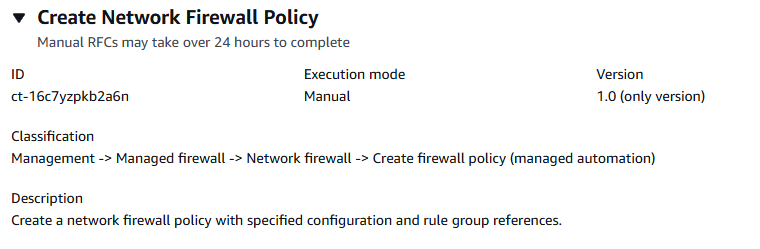 aws amscm create-rfc --cli-input-json file://CreateFirewallPolicyRfc.json --execution-parameters file://CreateFirewallPolicyParams.json您會在回應中收到新 RFC 的 ID,並且可以使用它來提交和監控 RFC。在您提交之前,RFC 會保持在編輯狀態,不會啟動。