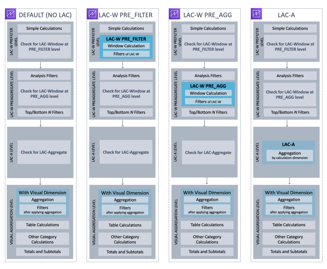 下圖顯示評估的順序。左側資料欄顯示不涉及等級感知計算視窗 (LAC-W) 或彙總 (LAC-A) 函數時的評估順序。第二個資料欄顯示分析 (包含要在預先篩選層級 (PRE_FILTER) 計算 LAC-W 運算式的計算欄位) 的評估順序。第三個資料欄顯示分析 (包含要在預先彙總層級 (PRE_AGG) 計算 LAC-W 運算式的計算欄位) 的評估順序。最後一個資料欄顯示分析 (包含計算 LAC-A 運算式的計算欄位) 的評估順序。在圖例之後,會更詳細地說明評估順序。如需有關等級感知計算的詳細資訊,請參閱 在 Quick Sight 中使用關卡感知計算。