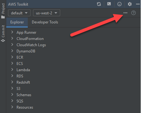 從 AWS Toolkit for JetBrains 選擇 Explorer 索引標籤以檢視與您的帳戶和區域相關聯的 AWS 服務。